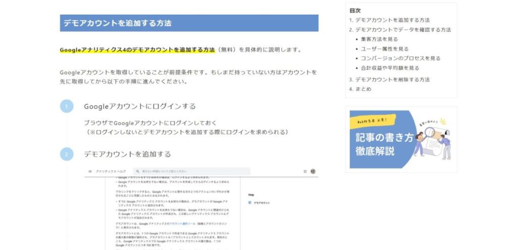 例えば「GA4デモアカウントを追加する方法」を図解付きで解説しており、初心者がつまずきがちな操作手順を丁寧にフォローしています。